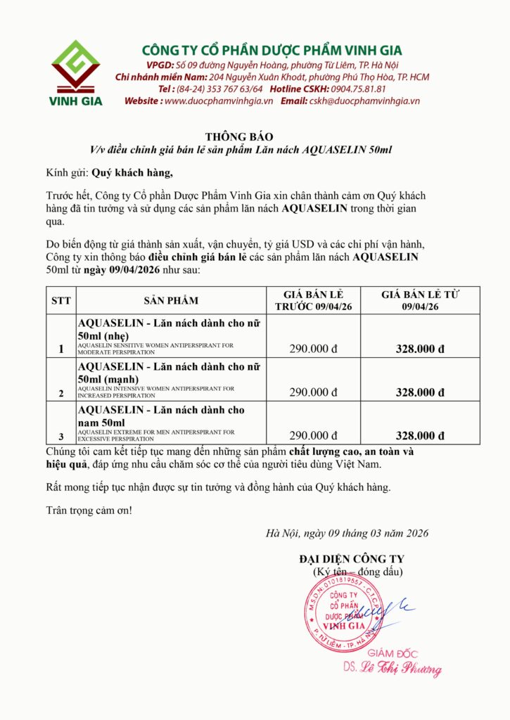 Công ty Cổ phần Dược phẩm Vinh Gia xin trân trọng thông báo về việc điều chỉnh giá bán lẻ đối với các sản phẩm Lăn nách AQUASELIN dung tích 50ml.